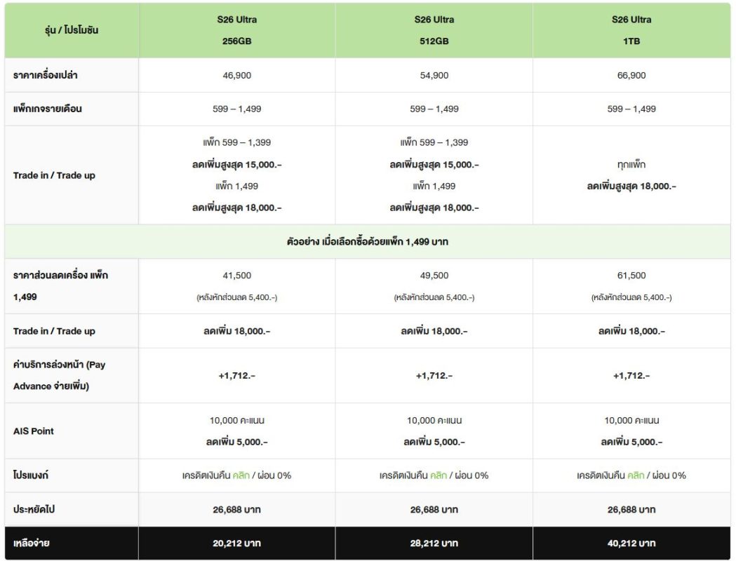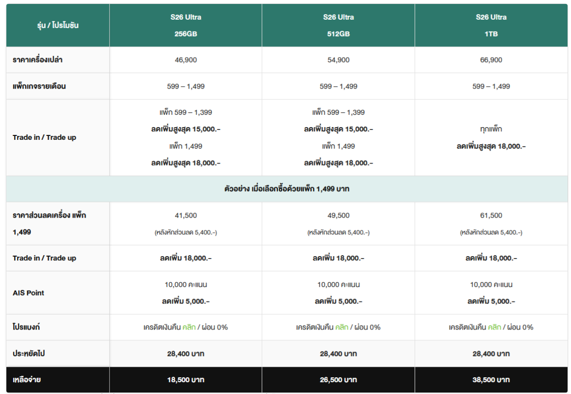 🔹 S26 Ultra ราคาลูกค้า AIS ที่ใช้แพ็กเกจรายเดือนอยู่แล้ว ล่าสุด