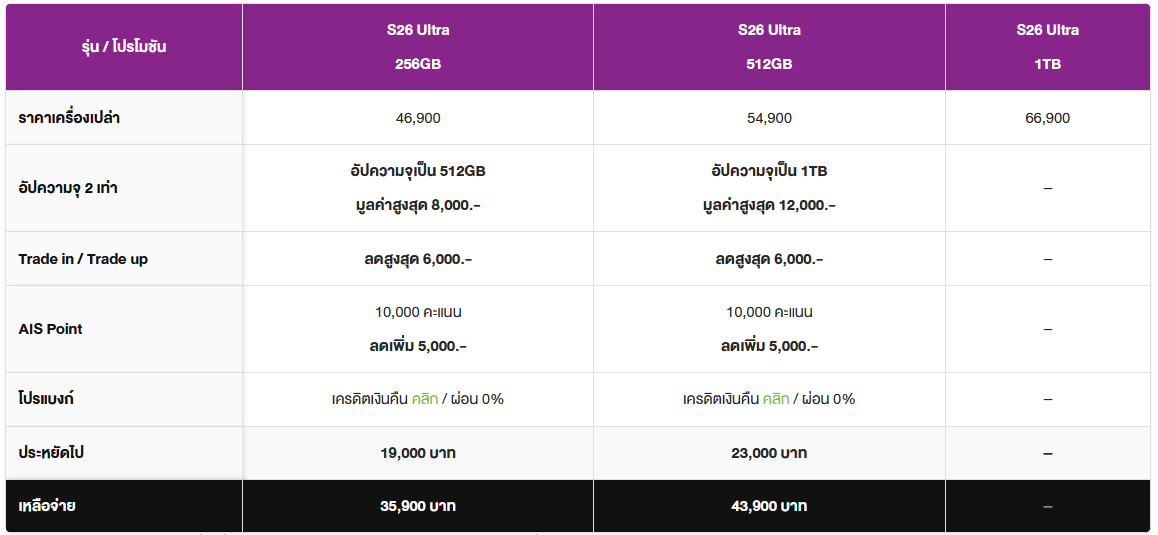 🔹S26 Ultra ราคาเครื่องเปล่า AIS ล่าสุด